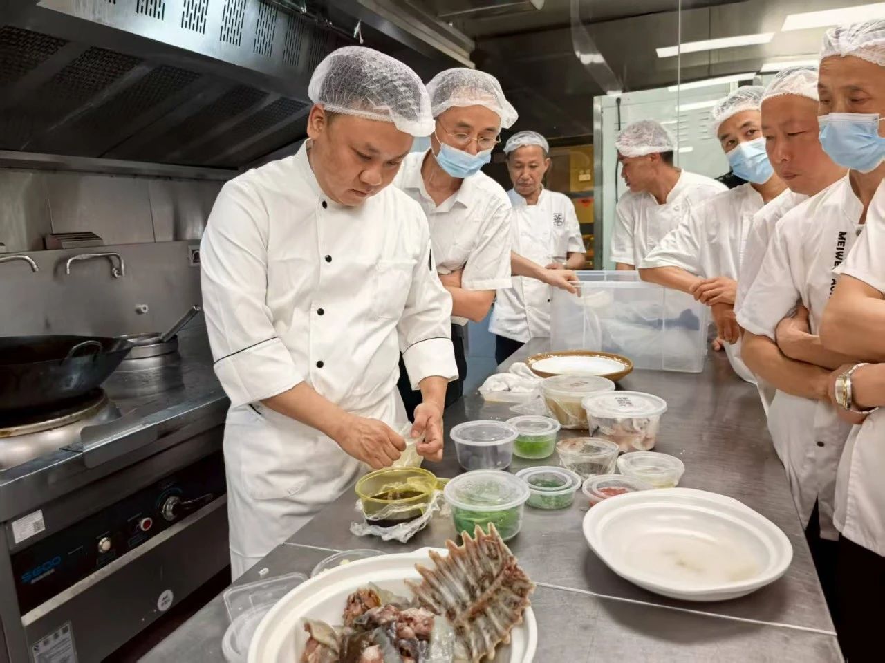 培训伊始,余明社楚菜大师工作室的大师们为公司参训厨师们现场演示葱烧有机武昌鱼、烧椒焖甲鱼裙边、排骨藕汤、珍珠圆子等经典楚菜制作。大师们从食材选择、加工处理到汤汁调配,再到火候把控,每一步都尽显楚菜技艺底蕴,让参训厨师们受益匪浅。