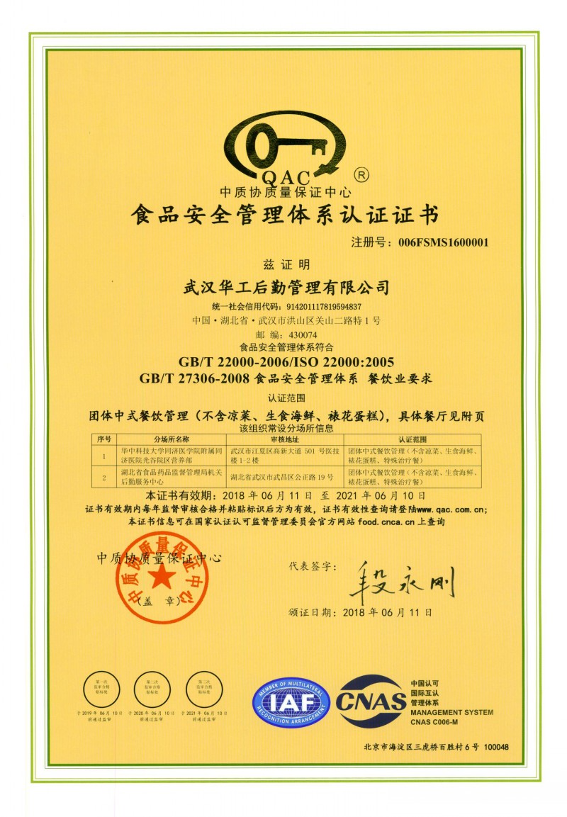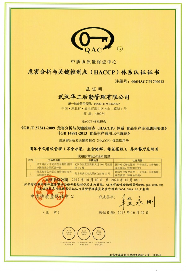 一、公司通过国家食品HACCP体系认证、ISO9001质量管理体系认证、ISO22000食品安全管理体系认证、ISO14000环境管理体系认证和ISO18000职业健康安全管理体系认证。