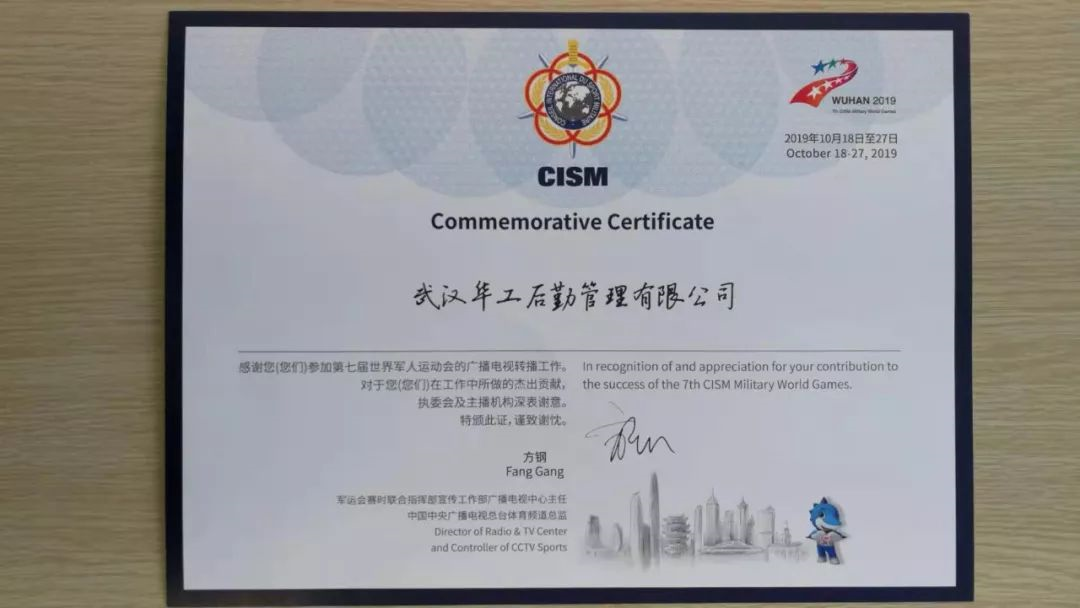 军运会赛时联合指挥部也发来感谢证书,对我们在第七届世界军人运动会工作中所做的贡献表示感谢。